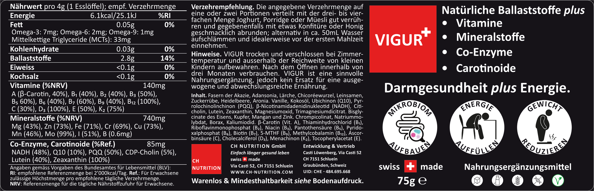 VIGUR - Präbiotische Ballaststoffe, Vitamine, Mineralstoffe, Co-Enzyme, Fette und Carotinoide bringen Dein Mikrobiom ins Gleichgewicht und sorgen für einen effektiven Energiestoffwechsel.